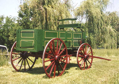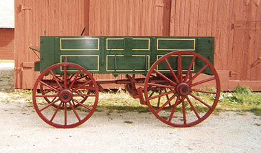 All Werner Wagons are handcrafted out of top quality materials and great attention is taken to ensure a superior product. From our new white oak fully ironed running gear to our all hardwood wheels with authentic style spokes and steam bent felloes. The riveted construction and white oak cleats on our yellow poplar boxes ensure a vehicle that will withstand the test of time. Our Wagons are equipped with a new ash drop tongue and a traditional mechanical gear brake. The Werner Wagon Works Double Box Wagon is 10'6" by 38" with 44" front and 52" rear wheels. Please check our options page for authentic and custom made items to add to your wagons.